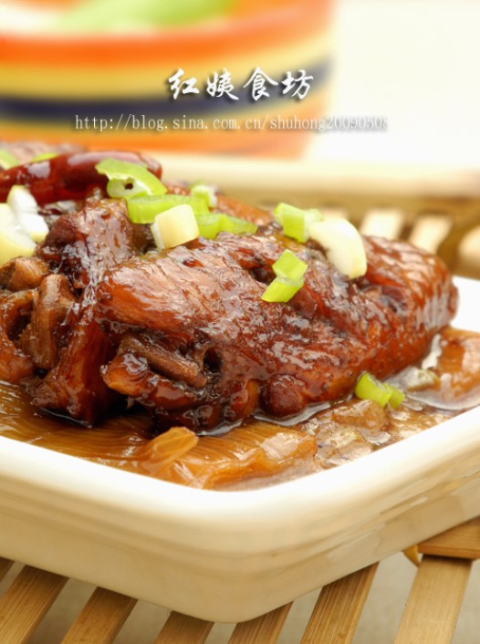 四、葱段平铺锅底,上面再放鸡翅,可以起到增香的作用