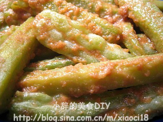 一、苦瓜切条,蛋黄捣成泥状备用,锅内油烧至六成热,下蛋黄泥,待全部起白泡时倒入苦瓜