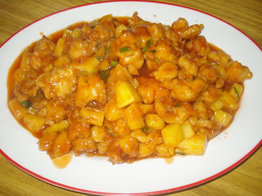 二十、放入切好的菠萝和葱.慢慢加入地瓜粉,勾芡成和糊状,相对上面鸡蛋和面粉可稀点