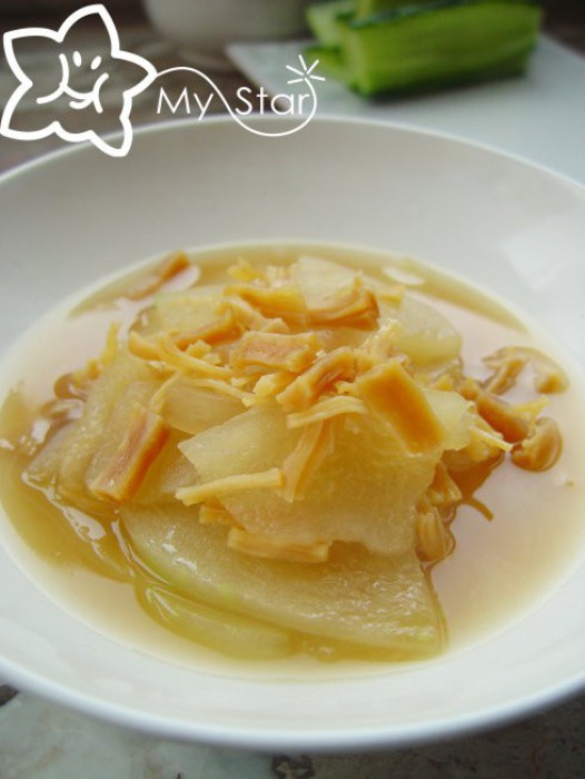 一、干贝撕成丝,用黄酒泡软。冬瓜切片