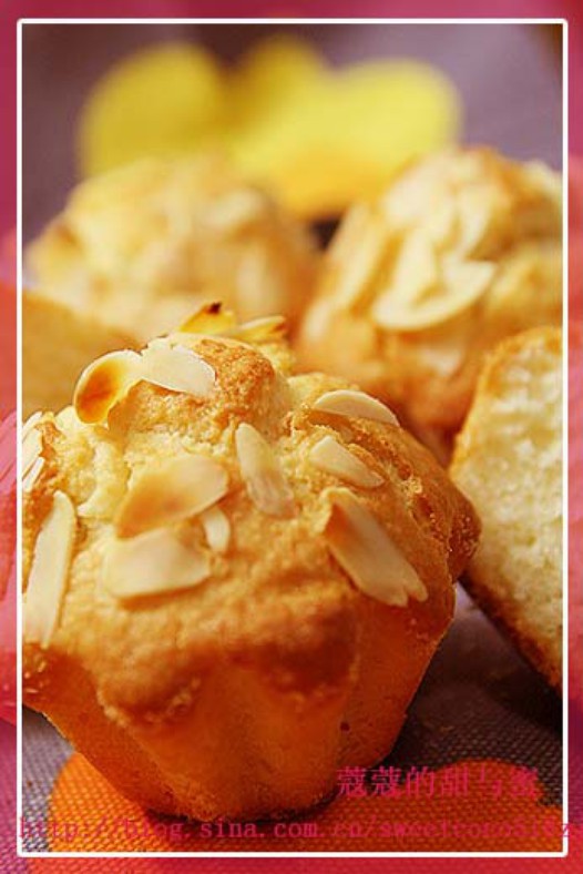 五、将面糊倒入模具内至七八分满,表面撒些杏仁片,入烤箱170度烤25分钟即可