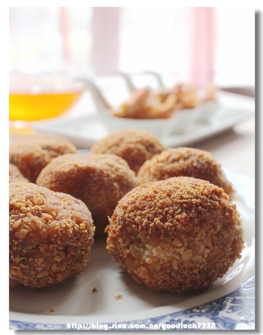 虾肉丸子是应小朋友的要求再次做的,新鲜弹牙的虾泥配上点猪肉,裹上面包粉油里一炸,很酥很嫩,剥下的虾头可别浪费了,自制一碗虾油,多香!炸过的虾头也挺补钙,当佐餐小食也挺妙。但是切记哟:油炸的东西尽量少吃!不可贪多!
