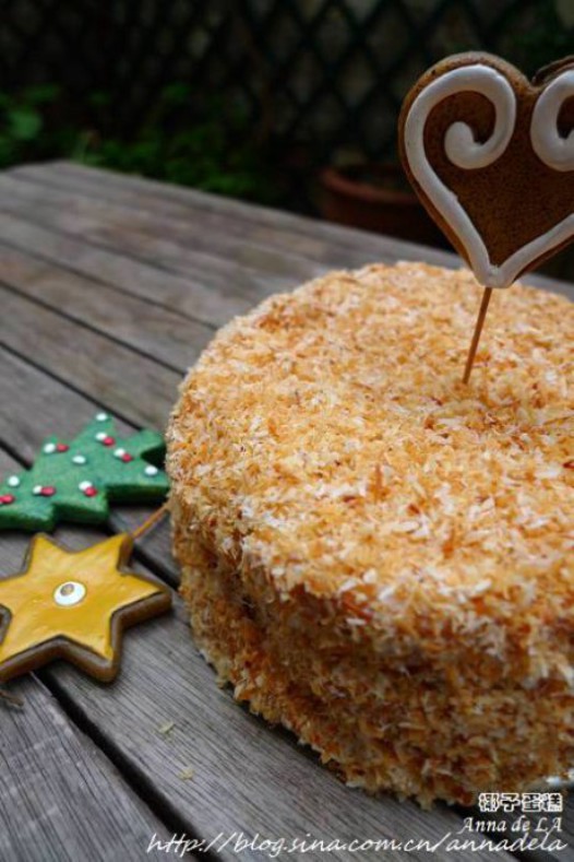 十、将打发的蛋白霜抹在一层蛋糕上,洒椰丝,再加上一层蛋糕,表面抹上蛋白霜,撒椰丝