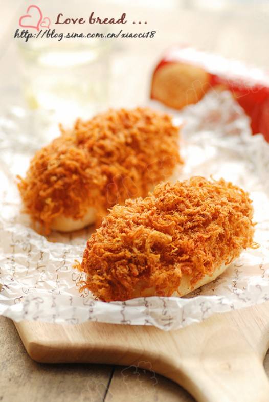 八、出炉后放晾网上冷却,凉后从中间剖开,夹入沙拉酱,面包表面也涂上沙拉酱,再裹上满满的辣肉松即可