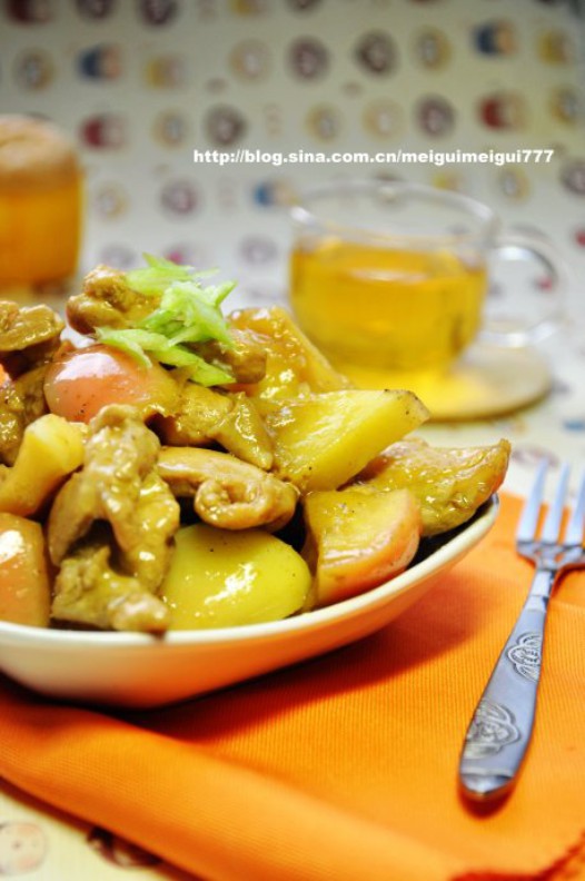完全就是乱炖。水果也是可以入馔的。土豆焖鸡块是我们家的最常做的家常菜。轻车熟路。有时候做成微辣的,颜色也很浓郁。有时候做成是红烧的,又咸又甜。有时候加几篇洋葱和胡萝卜再放一点咖喱粉,有时候加些青红椒块,有时候还会放一两个蘑菇或是豆角节,总而言之,不会让土豆和鸡肉孤孤单单的焖在锅里。久而久之,这道菜就家常的不能在家常。把苹果加进去,便可以让普通的一道家常菜多了一层新的内容,即刻间充满了果香。鸡肉更鲜嫩似的,咀嚼之间会有一点苹果的酸甜于其中。苹果、蒸鱼豉油、芹菜节,都是为了给鸡肉增香提鲜的。苹果炖熟后的口感仍很酸甜,出乎意料。芹菜节放进锅里,菜好后再去出来。蒸鱼豉油的浅香也为鸡肉增色不少,然后除了盐和糖,最后放了一点点黑胡椒粉。锅里没那多汁子。干爽而清淡。鸡肉很好的吸进了你所希望它具有的所谓的香味。土豆和苹果混在一起,不分彼此的亲密,就是下锅前一个着急,苹果没削皮就直接切成了块,也没什么不好哈,出锅后,变成了轻粉色,出挑的很。看来这道菜,也是浓妆淡抹总相宜了。