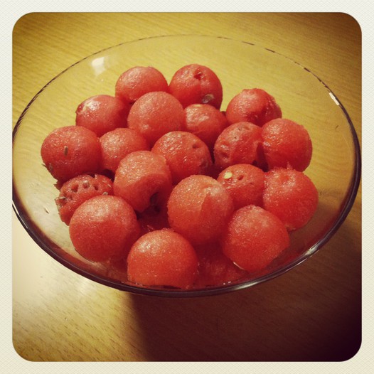 三、把西瓜挖成球状,装入色拉碗,冰镇2小时即可食用