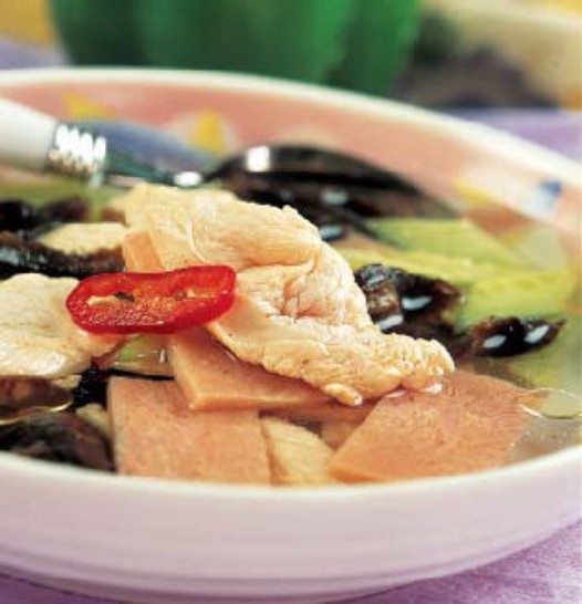 三、把鸡片、海参分别放沸水中氽透捞出,再把鸡片、海参片、火腿片放入汤碗中,淋入香油拌匀