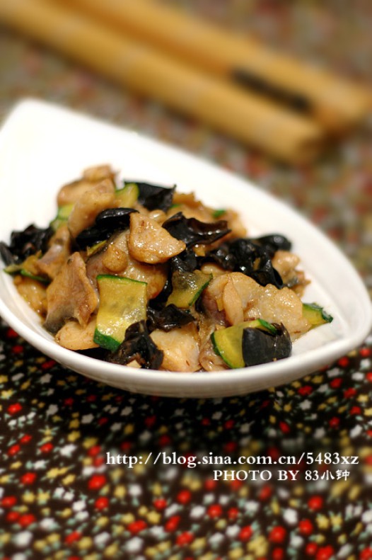 五、锅内余油再次烧热,下葱姜末炒香,下黑木耳爆炒,再倒入黄瓜片翻炒
