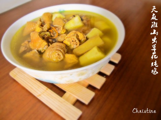 天麻有镇痛,镇静,降低血压,明目,祛风湿的作用,少量用到食物中,可以很好的调理身体。山药味甘、性平、无毒、有健脾、补肺、固肾、益脑、益精养颜、抗衰老、抗肿瘤、抗疲劳、抗有害物质刺激、调节代谢、增强免疫机能、促进生长、调节内分泌、调节心肺功能、兴奋制血系统、调节神经系统。虫草花性质平和,不寒不燥,有益肝肾、补精髓、止血化痰的功效。——Baidu炖出来的汤是漂亮的金黄色。这几样材料炖出来的汤鲜而不腻,且滋补的效果也特别好,汤色清彻,肉质鲜嫩,香气逼人。