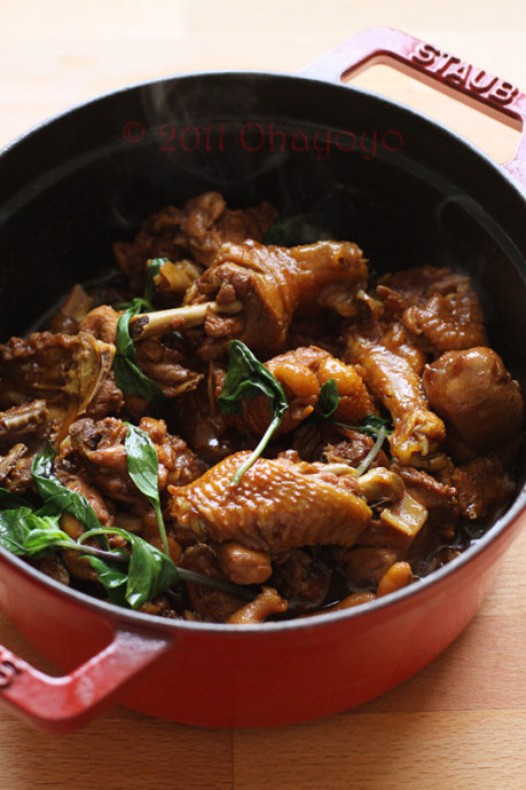 一、铺底的蒜瓣主要是为了防止鸡肉在大火下粘锅,因为这道菜是要收干汤汁的——如果是用铸铁锅或者砂锅来制作这道菜的话,铺蒜还是有一定必要的。如果觉得这样很麻烦,可以直接在炒锅中完成整个步骤,这样只需要增加一开始爆锅用的蒜量就行。(实际上我家的18cm铸铁锅还是显得大,两头蒜也铺不满。而我又不想再用更多的蒜了,没办法我只好把所有的蒜劈成两半好歹是铺满了二、关于香油的用法,也有将香油分成两部分,一部分用来炒鸡,另一些在最后菜快完成时再淋到鸡块上,然后再加九层塔。这种做法之后会再尝试,可能会有别样风味~