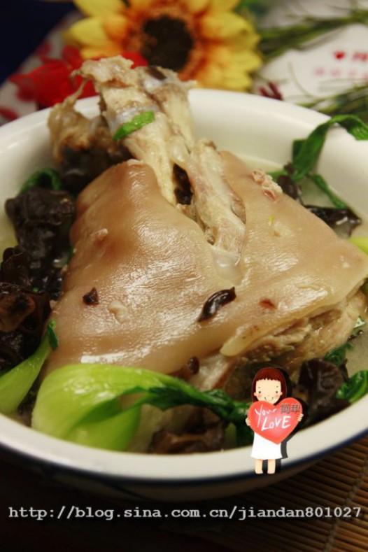 四、锅里放入蹄膀,加入足够量的水,放料酒,姜片和葱结大火烧沸后转小火将肉煮至酥烂,放入木耳和青菜,放入适量的盐调味后即可食用