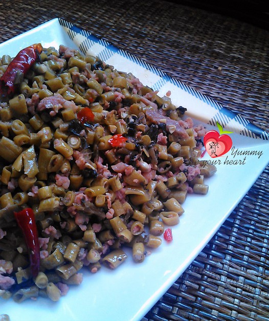 夏天胃口不好的人,吃这道菜准开胃了。我爸爸吃了这菜,晚上吃了好多肉呢哈哈。酸豆角的制作方法比较漫长,夏天还好,三天;冬天可就要一个礼拜了。这是桂林米粉的招牌:酸豆角肉末,我加了芽菜,更吊味了。