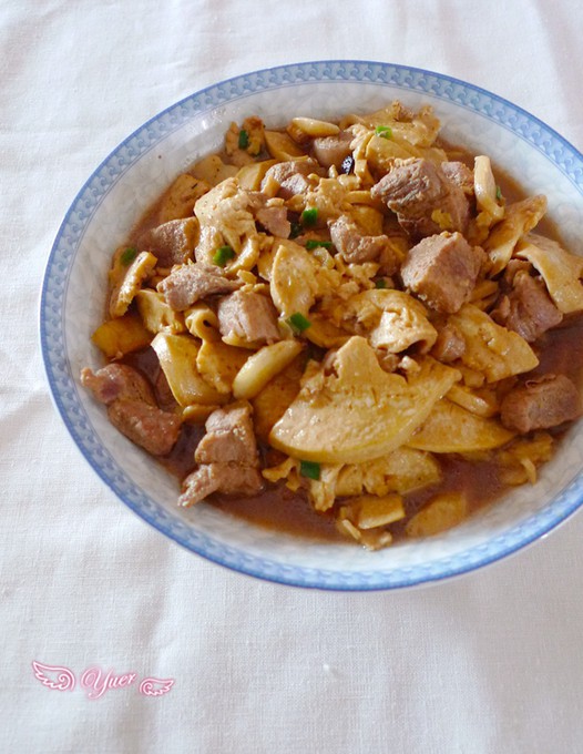 二、锅中倒油,烧热:先下姜片大蒜,炒出香味后把沥干水的肉丁倒下去翻炒至表面微焦。