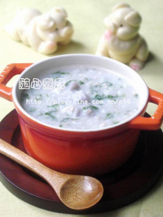 今天按照涂中教的方法做了这个芋头青菜粥,真的好好吃哦。小老鼠的爸爸的一下吃了三碗,小老鼠也吃了一小碗。我也专门煮粥给小老鼠吃,很多材料都放过,唯独没想到放芋头。放了芋头的确实不一样.本人非常喜欢芋头,这次放了半个,下次要多放一些。虽然没煮熬到芋头和米粒完全融化,但是这样已经很好吃了。以前我们家很少很少煮粥吃。即使煮也都是煮白粥多,这个芋头青菜粥将会改变我家的饮食习惯,今后我家的餐桌上会经常出现芋头青菜粥哦。这么冷的天,一碗芋头青菜粥下肚,暖到心底啊。菜谱提供:曳尾于涂中要点是,槟榔芋切丁后要炒过,和米一起下锅,这样可让最后熬出来的粥完全看不到芋头,却因其完全与米粒交融而让每一粒米都饱浸了芋头的香味。水要多,否则放了辅料后粥会变得太稠。辅料可包括肉末,姜末,芥菜末。前二者可随米和芋头一起下锅,图的是芋头、肉末、米粒全部融合在一起。芥菜末却要等熄火起锅后才放,完全靠粥的热量来烫熟它。这样的好处是,粥盛到碗里,菜还是鲜绿的。