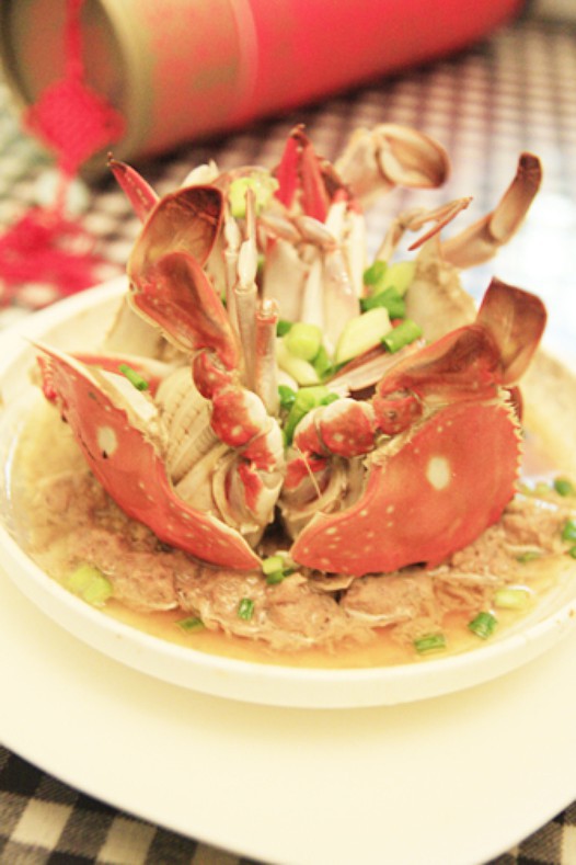 三、把切好的梭子蟹倒竖在肉末上,大火蒸熟。蒸熟后取出撒葱花。蒸好后如果汁水太多,可以倒掉一部分。