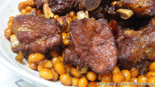 二、锅中放入适量油,4成热时,放入花椒八角炒香后捞出,随即放入白糖,中火炒至白糖溶化变成褐色时,将排骨倒入锅中翻炒,上糖色。煸炒2分钟左右,上色均匀时放入姜继续炒香,此时再放入一茶勺料酒及少量老抽,适量盐,翻炒均匀后放入黄豆,大火翻炒5分钟左右