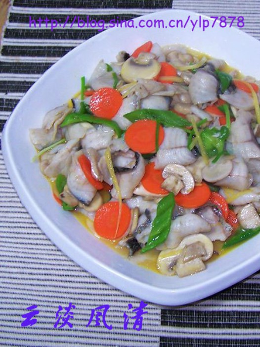 五、炒锅下油烧热,用葱丝丶姜丝、蒜片爆香,放入青椒丶口蘑丶胡萝卜片,加入盐丶鸡精丶白糖翻炒,倒入焯好的乌鱼片快速翻炒几下,用水淀粉勾芡,淋香油出锅即成
