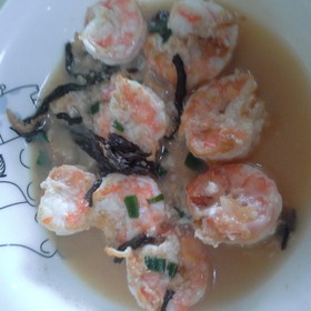 四、2.倒入河虾,加料酒烧沸至断生时,加味精,捞入盆内,去葱结、姜片,舀入原汤即成。