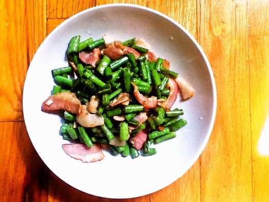 三、豆角炒至8成熟后捞起,将培根放入锅内翻炒出油并带有焦香。