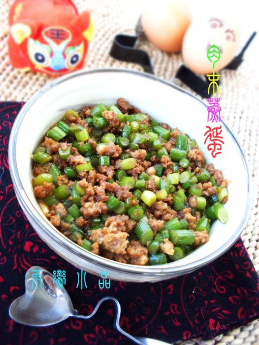 九、蒸至蛋液基本上凝固的时候关火,掀去碗上的保鲜膜,然后用勺子舀入准备好的蒜薹和肉末