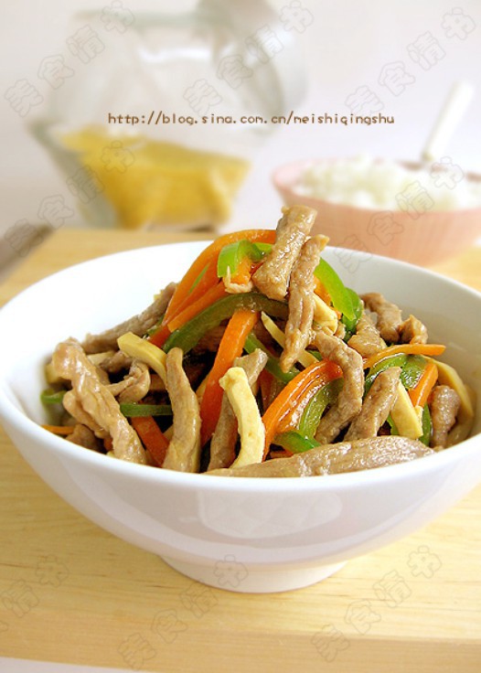 一、把牛肉洗净,切丝,青椒切蒂,去籽,洗净后切丝。胡萝卜洗净切丝,豆腐干切丝
