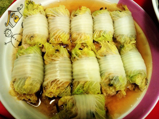 三、将烫软的娃娃菜叶铺平,放上肉馅,卷起,入盘,撒上鱼露