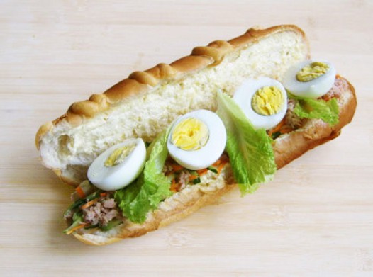 五、将生菜、胡萝卜、黄瓜、金枪鱼依次夹入面包中