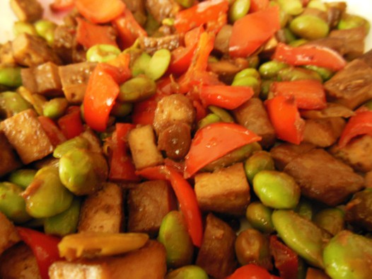 四、在油锅中加入切好的豆干和红椒,翻炒两下,加入煮过的毛豆,稍炒一会,等把水分炒掉一些的时候再加调料。