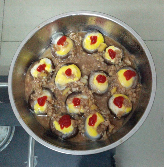 六、最后每个香菇蛋上点上番茄酱装点即可。