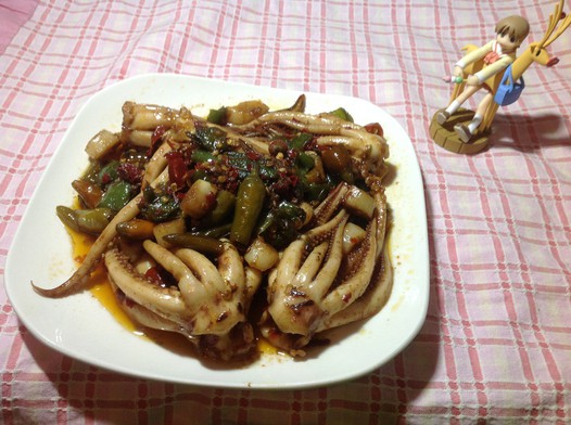 这道菜是我老妈教会的,话说好久没做,步骤有些搞错了,不过没事儿,味儿是妥妥的。稍微说下,其实鱿鱼可以剪开2条一段,我忘了。。。不过貌似卖相挺好。。嘿嘿