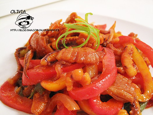 四、翻炒均匀后,把提前炒制好的鱿鱼卷放入锅中继续翻炒