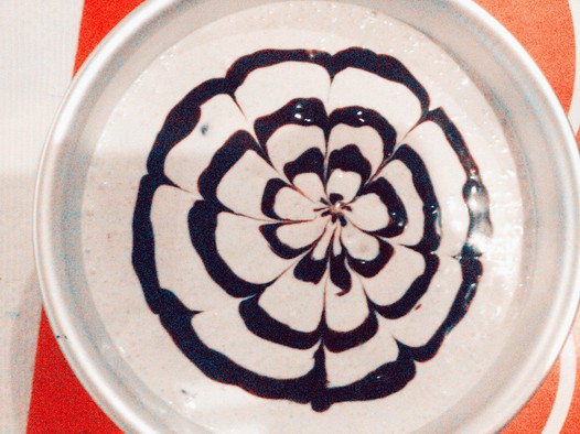 七、上面的花纹:把巧克力融化成巧克力酱,以圆圈的形式,小心翼翼的的点在奶油奶酪的模具里。
