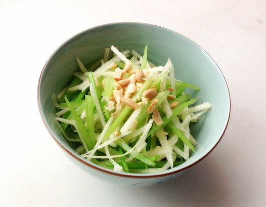 三、苹果去皮去核,切成细丝,与水芹丝拌匀,撒上坚果碎,齐活!