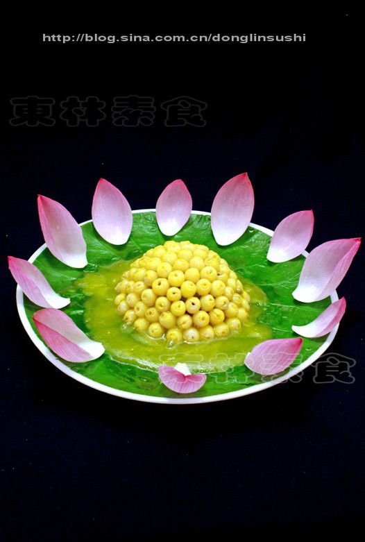 六、已压入芋头泥的莲子碗,上电饭锅中蒸10分钟,出锅后反扣在已铺上荷叶的盘中。锅内倒入少许鲜橙汁加少许冰糖勾芡淋在莲子上,边上用荷花瓣点缀即可
