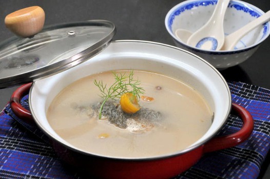 三、把汤转移到搪瓷汤锅继续小火熬煮約十五分钟至汤色完全变奶白(期间小心地把鱼翻动一遍),栗子也变粉糯,加盐调味,整锅端上桌。
