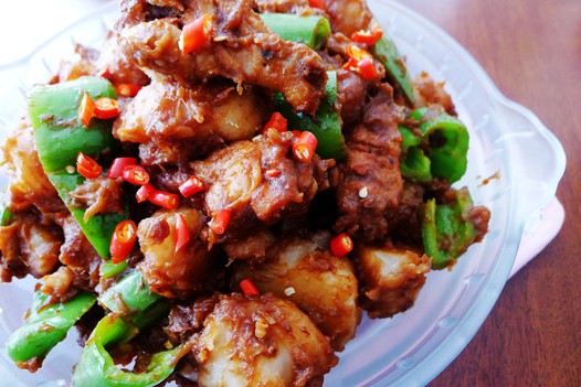 六、待锅内水分渐干,鸡翅油分出放入土豆继续翻炒后加入适量的水,烧至鸡翅土豆软糯,加入青椒将锅内水分收干即可。最后一步可根据个人口味加盐与否。