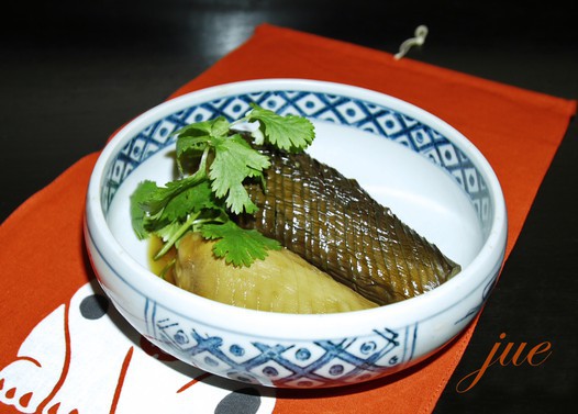 二、锅里放清汤、みりん、鲜酱油,把茄子和杏鲍菇放入,滚后转小火煮15分钟,盛出装盘,把汤汁浇在上面即可