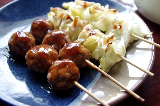 五、烤箱预热.烤盘刷上橄榄油,将牛肉丸和包菜上串放入烤箱.