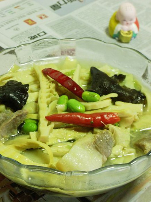 二、滚后去沫,加笋干毛豆黑木耳盖上锅盖烧十五分钟