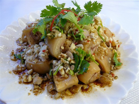 二、另用半锅水加葱、姜放入剁成小块的猪脚,中火煮30分钟后取出,马上用冰水冰凉,冷却后捞出,投入料酒、高汤、精盐、味精浸腌6小时。