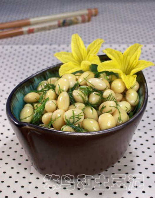 二、把茴香切碎,拌入熟黄豆中,调入适量油、盐拌匀即可