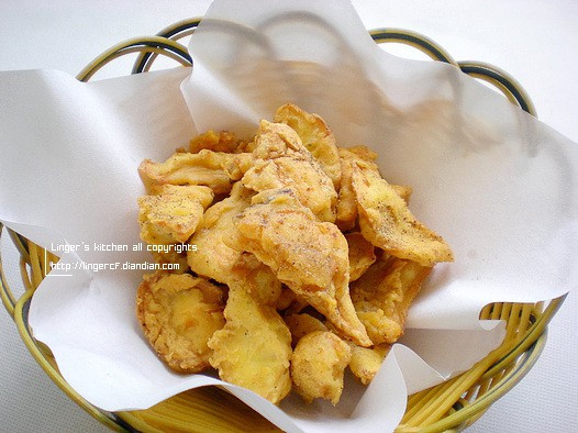 二、油锅加热至160度左右,逐一放入杏鲍菇块并用勺拨开;边炸边用炒勺不停翻动使色泽均匀,炸至金黄色捞出,乘热撒上胡椒粉,吸油装盘。