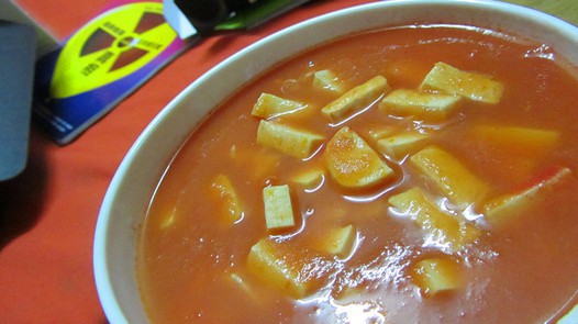 二、把蕃茄汤倒进锅里把豆腐切小块放进去。然后煮沸转中火煮到豆腐漂浮翻滚。很像小时候动画片里巫婆煮的汤。。煮得我很嗨~~