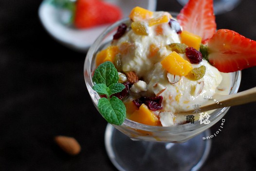 五、挖两个酸奶冰淇淋球放在最上面。酸奶冰淇淋做法戳这里:http://www.xiachufang.com/recipe/267591/
