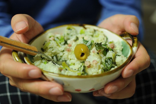 在寒冷的夜晚,捧着这碗饭就足够了吧。其实可以随心所欲,咸肉和青菜切好,可以与米饭一同煮,可以等米饭煮好再放进去闷,也可以先放咸肉再放青菜。