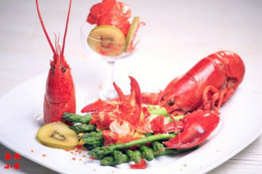 四、煮熟的芦笋垫底,龙虾肉等装盘,撒少许鲑鱼籽用奇异果片装饰即可