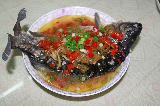 二、腌好的鱼放在盘中,鱼身上铺上青红剁椒,水开蒸熟,10分钟左右(鱼眼发白)取出。鱼身上在撒上姜丝。