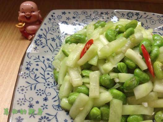 七、倒入毛豆子炒到断生,加一点点点盐(千万不要多,西瓜皮是腌过的)继续炒到有点要脱皮的样子,倒入西瓜皮;