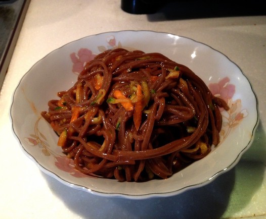 天气热啊,不知道吃啥好,双休日赖在家又不想出门,肚子又饿只能自己动手啦?打开冰箱发现上周买的荞麦面还没开封,正好家里有黄瓜和胡萝卜,那就来个酸酸甜甜辣辣的拌面吧^_^