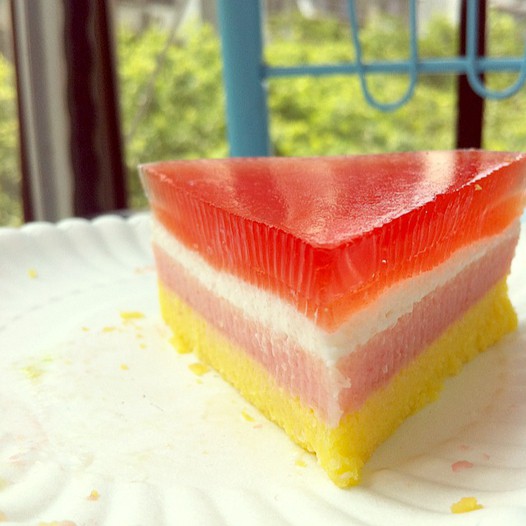 七、但是……其实味道还好吃。一口吃下去,QQ糖的味道-西瓜的味道-酸奶的味道-还有淡淡的奶油味道。很清爽不甜腻,很适合夏天。切块比蛋糕本身好看很多这是做孽啊!